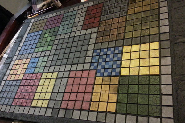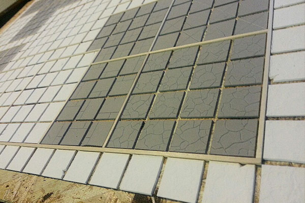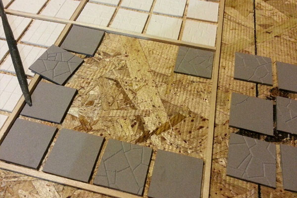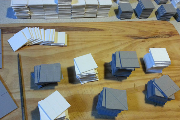 After a couple days of cutting tiles and using a metal file to score the different patterns and floor designs into the tiles, I found myself with hundreds of these things, waiting for a board to be put on.