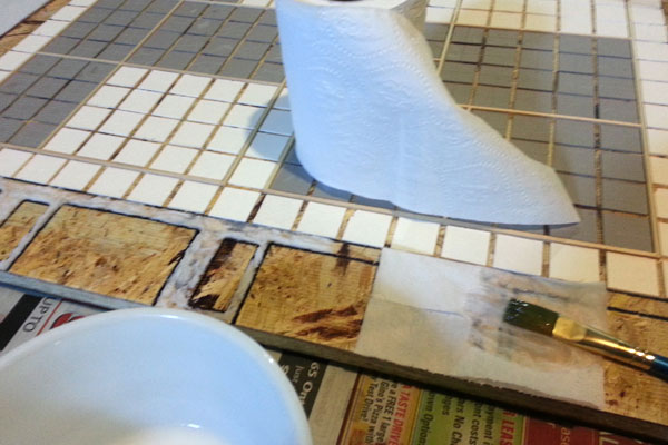 Once the "walls" were all in place, I began placing all the tiles for the rooms, using wood glue to attach them to the board, and a metal file to help position them.