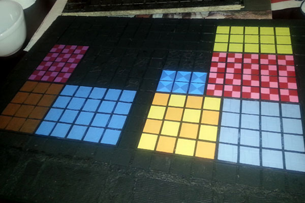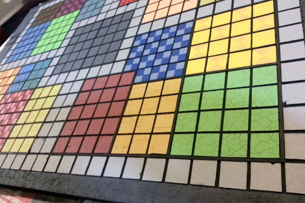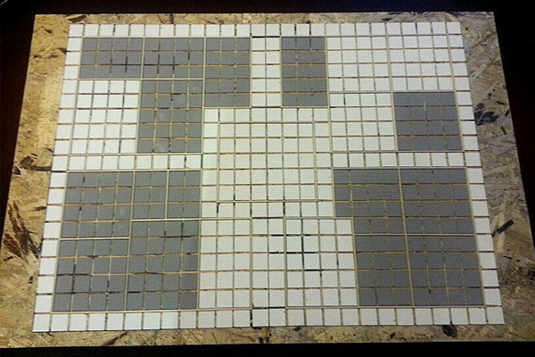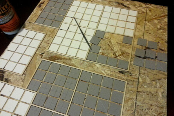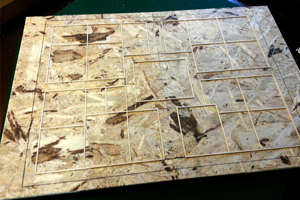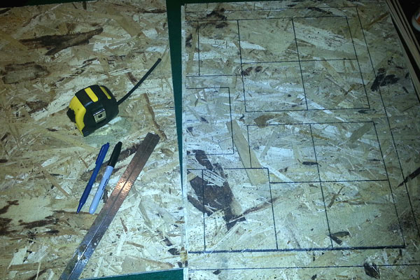 For the board itself, I found a couple pieces of 2' x 2' particle board used for the base of cement flooring at my local home building centre. They were only $7 a piece, and they have a tongue and groove connection, as well as a bottom covered with a piece of thin plastic with raised "feet", so they won't slide around on a table, and they're slightly raised and easy to pick up. After cutting off about 6 or 7 inches on each board with a band saw, I began measuring and marking the floor plans for my board. The floor plan based on the 1" square tiles, and an 1/8" gap between tiles.