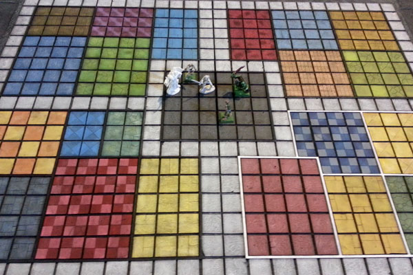 And now witness the magic of dry-brushing!! My absolute favourite painting technique, and grossly overused by me from the time I started painting miniatures and scenery. It worked pretty well on the board, though, and I'm very pleased with the results. There are some Reaper minis and a couple Warhammer Fantasy guys on there to show the scale. At this point, I had painted the "walls" of one quadrant white.