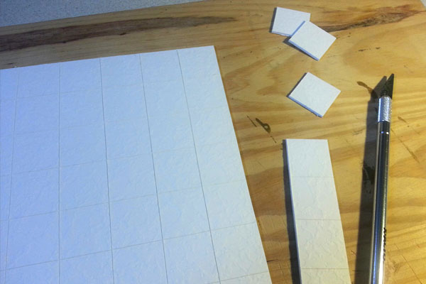 I started by making the tiles. I found some textured and non-textured card stock that I happened to have on hand. I don't know the cost of this stuff, but I can't imagine it to be too expensive, and I'm sure there are alternatives that could be used for tiles. Any thin, flat cardboard, even cereal box card, would likely work (you can add the texture yourself!).