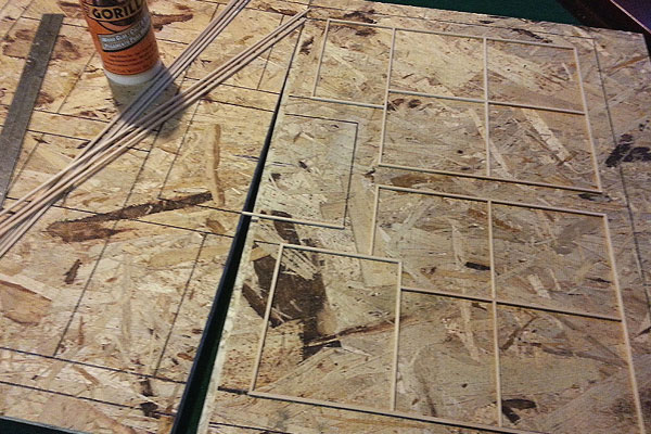 Next, I headed over to my local craft supply store and grabbed some 1/8" x 1/8" square basswood dowels, each 2 feet long. They are $1.29 each, and I ended up needing 12 of them to complete all the "walls" on the board. I cut them to size for the walls and used wood glue to secure them.